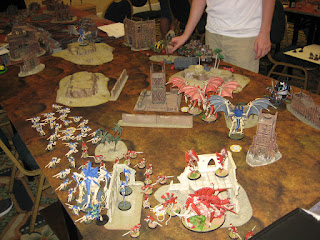 Game 1 I had the pleasure of playing against Darren, a guy I had met playing Frostgrave at a friend's house. He brought an Ynari list that was focused mostly on Dark Eldar and Harlequin troops. There was a single Eldar Autarch in the list (for Reserve manipulation I suspect). The list was predicated on getting off some timely Soul Burst actions and having multiple units unload poison. As a Tyranid player, this could work really well as I had no metal bawkses for me to hide my units. I did however have two Flyrants and Psyker superiority.